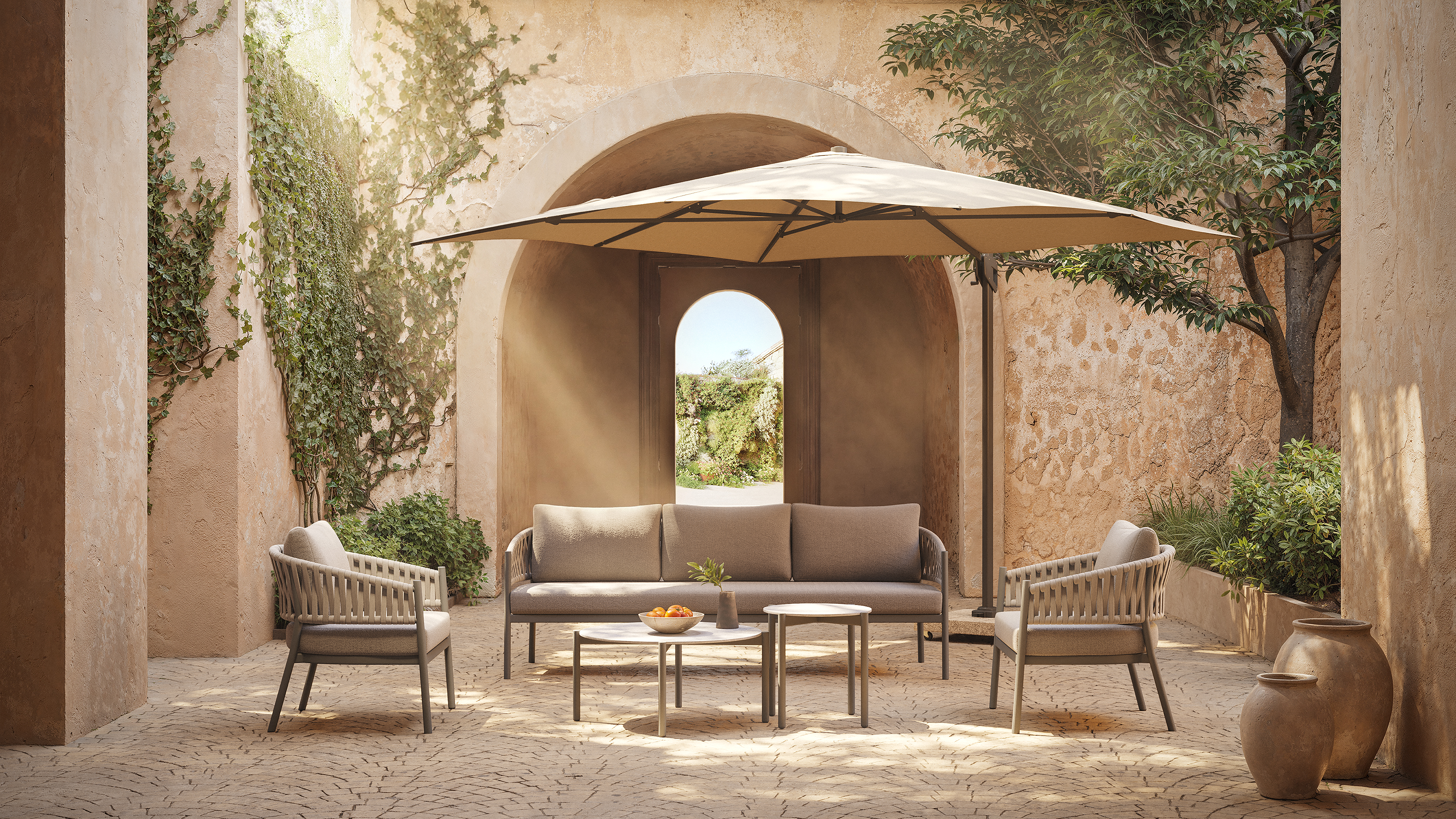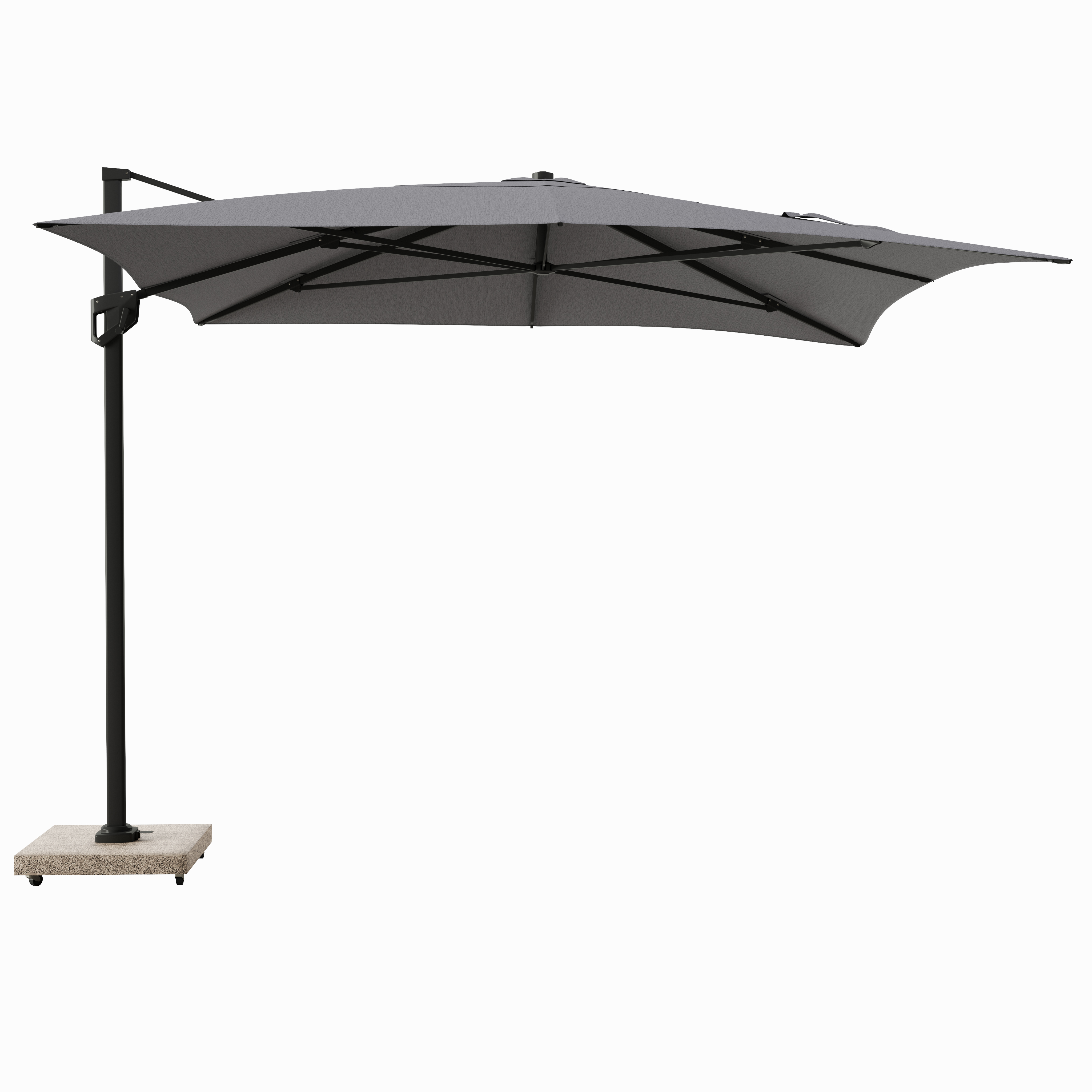 Parasol déportéDe Malaga is een vrijstaande parasol van 300×400 cm die royaal schaduwcomfort biedt. Dankzij de pedaal is hij 360° draaibaar en eenvoudig in hoogte verstelbaar. De parasolvoet is uitgerust met vier wielen, elk met een rem, waardoor de parasol eenvoudig verplaatst en stevig vastgezet kan worden.